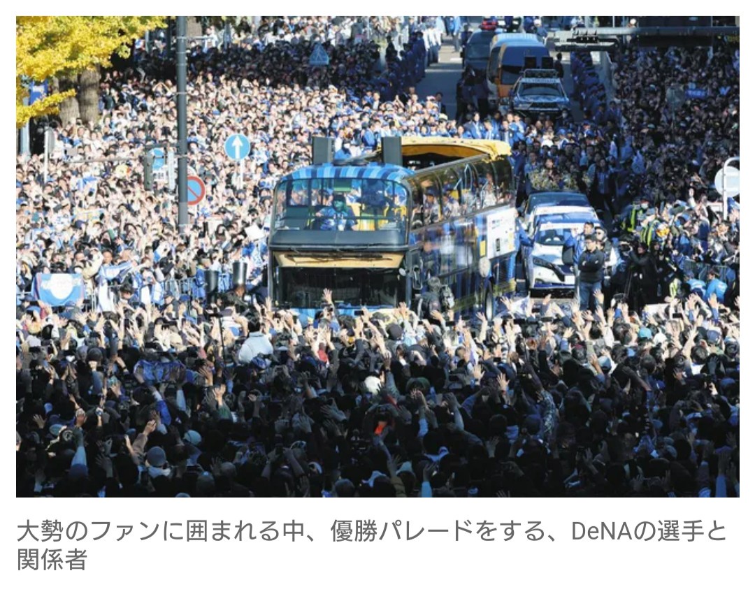 セ・リーグ3位から26年ぶりに日本一になったDeNAの優勝パレードが30日、横浜市であり、約30万人のファンが祝福した。