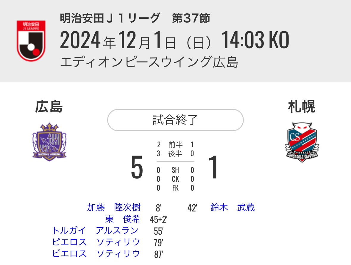 広島の勢いは止まらず、88分にはCKから東俊希のボールにピエロス・ソティリウがヘッドで合わせ、ダメ押しの5点目。試合はこのまま終了し、5-1で大勝を飾った。この結果、勝ち点を68まで伸ばすことに成功。首位・ヴィッセル神戸と1ポイント差で、運命の最終節へ挑む。