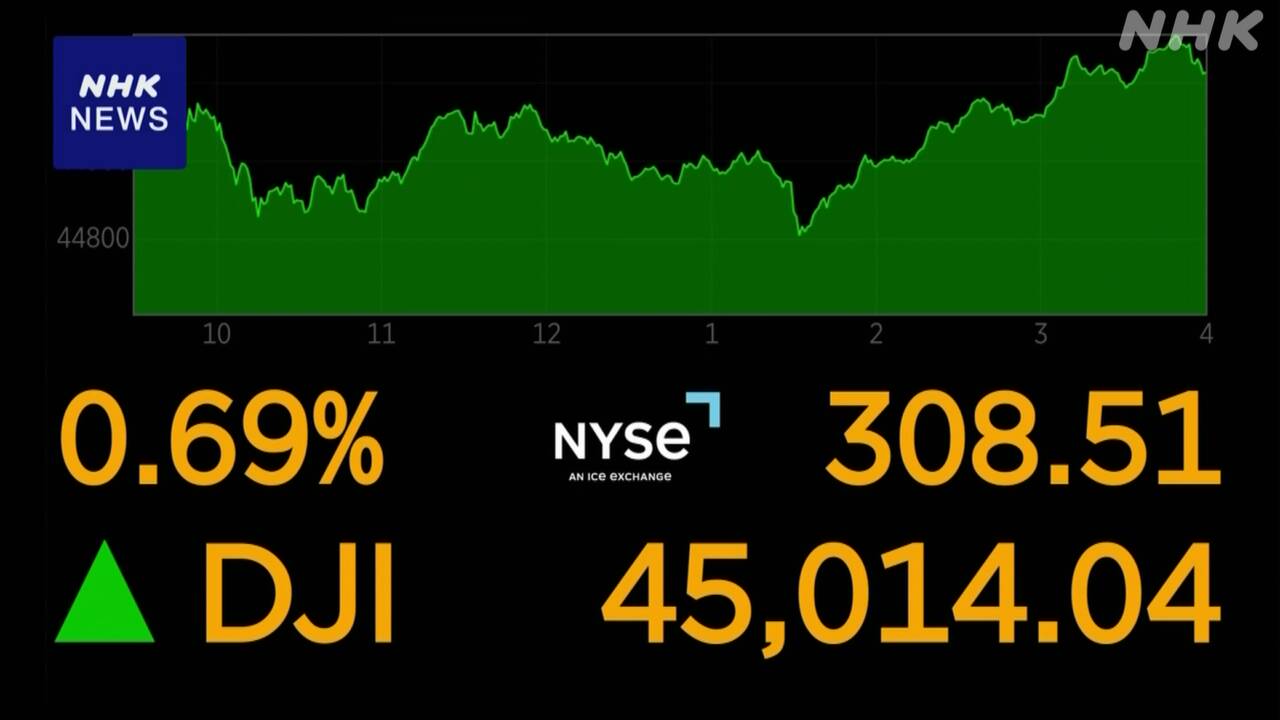 ダウ平均株価の終値は前日と比べて308ドル51セント高い、4万5014ドル4セントで、終値として初めて4万5000ドルを超えて最高値を更新しました。