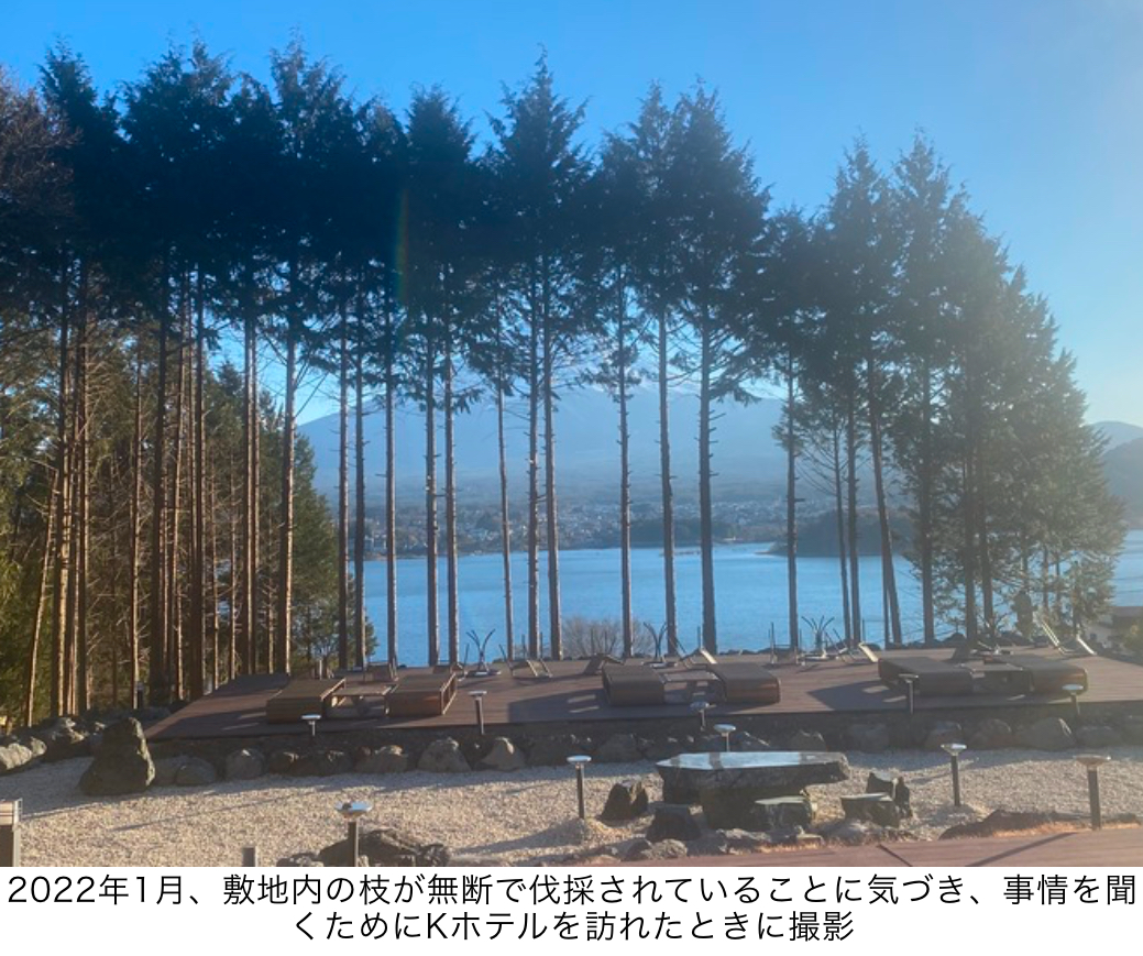 山梨県富士河口湖町にある中国資本ホテルが「あなたの家の木のせいで富士山がよく見えない」という理由で隣人宅のヒノキを無断で伐採、さらに除草剤を注入した事件。
