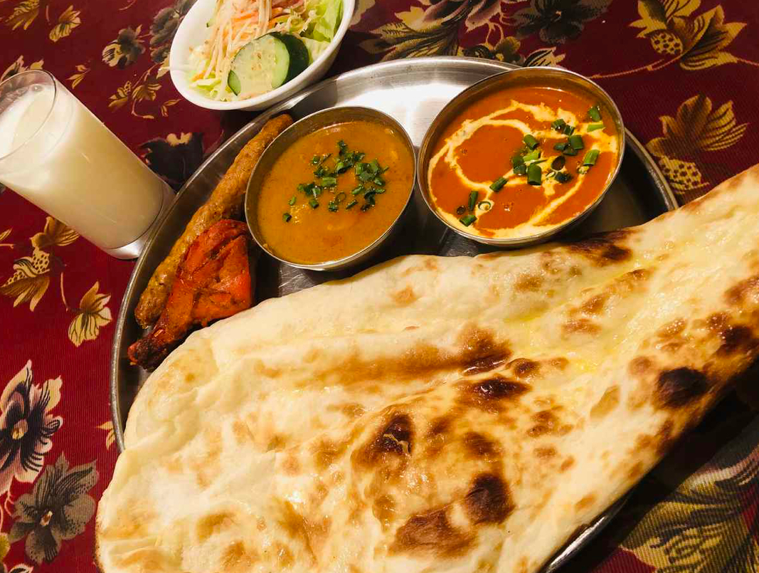 日本人の好みにあわせ、スパイスを控えて甘めに味付けしたバターチキンカレー、巨大でやわらかいナン、タンドリーチキンの組み合わせが王道のメニューだ。