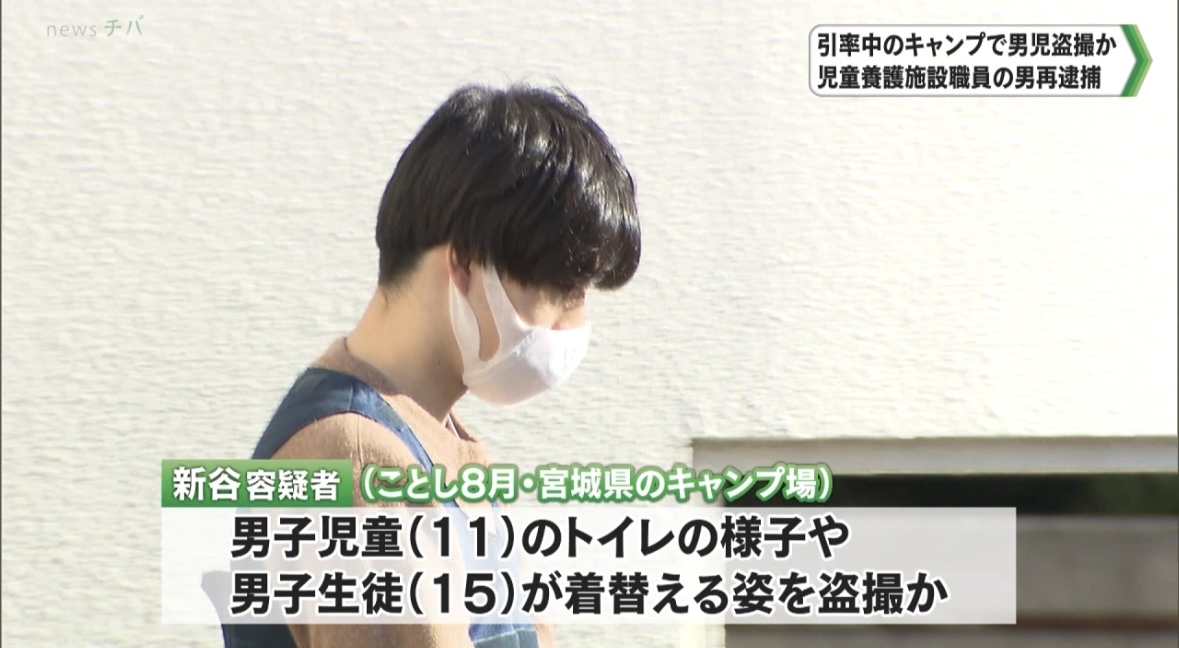 千葉県警によりますと、新谷容疑者は2024年8月、宮城県のキャンプ場で、11歳の男子児童のトイレの様子や、15歳の男子生徒が脱衣所で着替える姿を盗撮した疑いが持たれています。