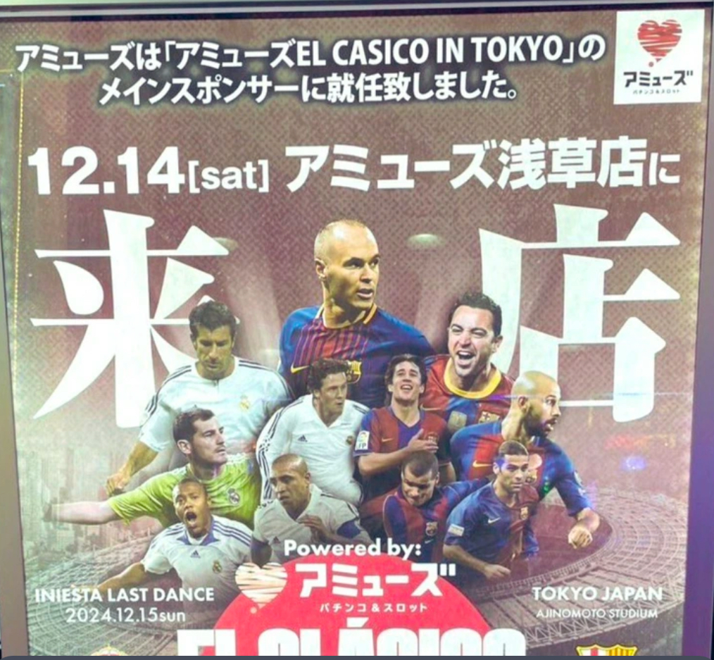 東京・浅草のパチンコ店「アミューズ浅草」に12月14日、スペインのサッカーチーム「FCバルセロナ」と「レアルマドリード」のレジェンド選手らが来店することが発表されました。