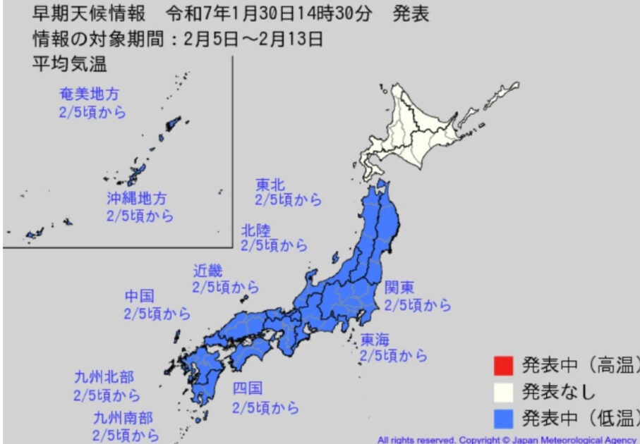 2025年1月30日(木) 16時12分気象庁は1月30日、「低温に関する早期天候情報」を発表しました。北海道を除く全地域で2月5日頃から気温が低くなり「10年に1度程度の低温」になる可能性があります。