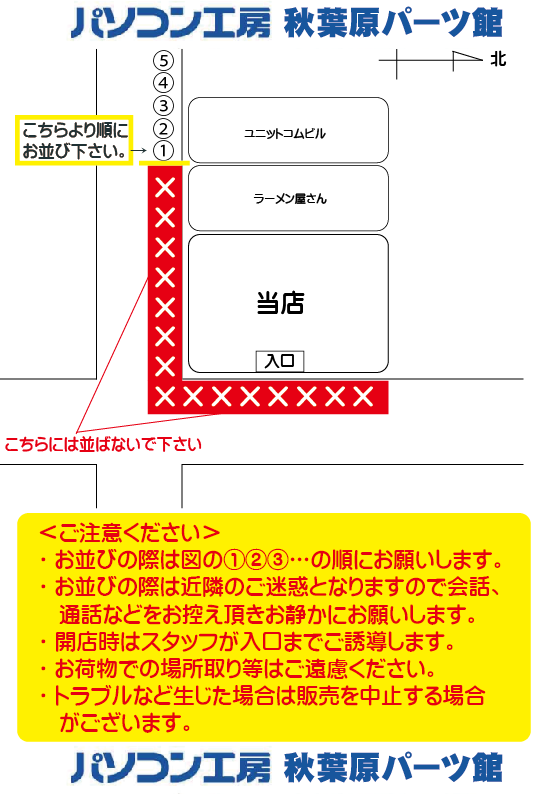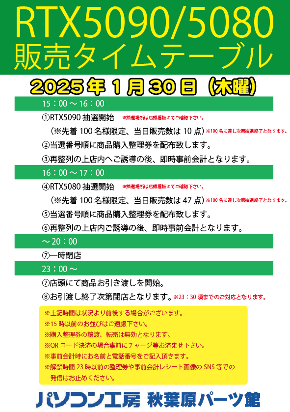 パソコン工房では当初、1月30日15時よりRTX 5090、16時より同5080の事前抽選(各商品先着100人限定)を実施すると告知。あわせて、待機列の形成位置と、15時以前に並んだ人は抽選対象から外す旨を案内していた。