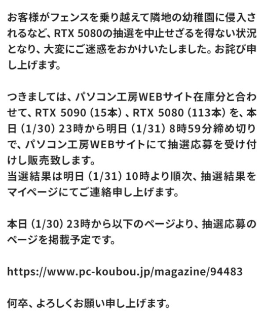 東京・秋葉原のパソコン工房パーツ館(以下、パソコン工房)で1月30日、「GeForce RTX 5090/5080」の店頭抽選販売を実施したところ、購入希望者が殺到。一部が近隣の幼稚園に侵入するなどのトラブルを起こし、警察が出動する騒ぎとなった。