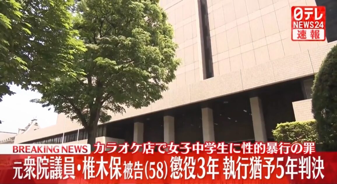 【速報】カラオケ店で女子中学生に性的暴◯ 元衆議院議員・椎木保被告(58)に懲役3年、執行猶予5年の判決 東京地裁去年8月、東京・新宿区歌舞伎町のカラオケ店で、当時12歳の中学1年生の女子生徒に性的暴◯を加えた罪に問われている元衆議院議員の椎木保被告(58)に対し、東京地裁は3日、懲役3年、執行猶予5年を言い渡しました。