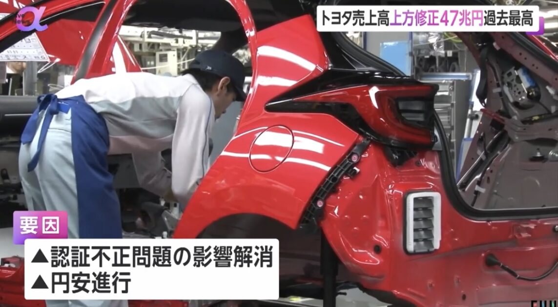 トヨタ自動車は、2025年3月までの1年間のグループ全体の業績予想について、売上高をこれまでの46兆円から過去最高となる47兆円に上方修正したと発表しました。