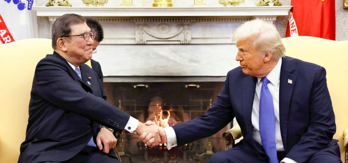 日米首脳会談でトランプ米大統領(右)と握手する石破首相(7日、ワシントンのホワイトハウスで)=須藤菜々子撮影