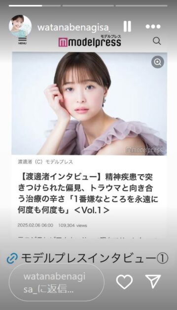 渡邊さんはストーリーズ機能で「1番嫌なところを永遠に何度も何度も」「見えない人の暴力的な言葉に自分を左右されたくない」「苦しみに直面してまで世に届けたかったこと」などと3つのインタビュー記事の見出しがそれぞれ書かれた、自身の近影も掲載された画像を紹介した。
