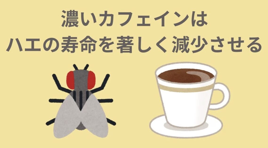 実験では、カフェインを砂糖水に混ぜてヒロズキンバエの成虫に与えることで、ハエの寿命が著しく減少することを発見しました。
