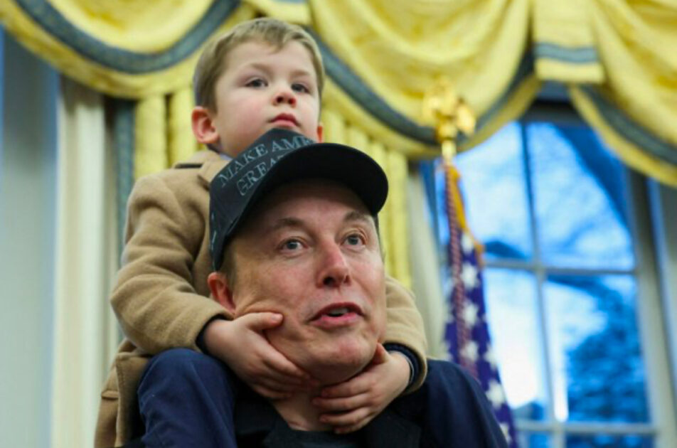 2025年2月11日、米ホワイトハウスで息子を肩車しながら記者団の取材に答えるイーロン・マスク氏=ロイター