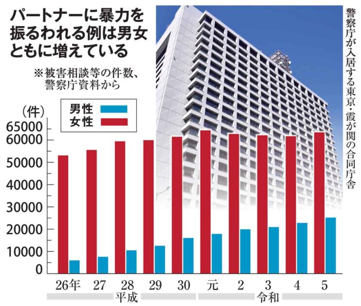 配偶者や恋人からのドメスティックバイオレンス(DV)に苦しみ、警察に被害を相談する男性が近年急増している。全国の都道府県警では、令和5年に過去最多となる2万4684件の相談を受理。女性からの相談の半数以下にとどまるものの5年前の約1・5倍、約20年前の170倍に増えた。「男は強くなければならない」「女性からの暴力や暴言にも耐えるべきだ」。DV被害者の支援団体では、こうした社会の風潮に変化が生じ、隠れた被害が顕在化したためとみる。