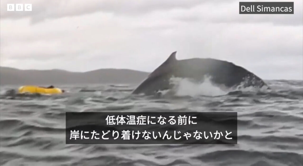 アドリアン・シマンカスさんが、父親のデル・シマンカスさんと一緒にカヤックをこいでいたところ、巨大なクジラが突如浮上。クジラはアドリアンさんを黄色いカヤックごと飲み込んだ。アドリアンさんは数秒後に吐き出され、無事だった。