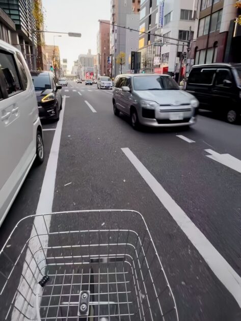 もう片方の手でカメラまたはスマートフォンを持って撮影しているとみられる。撮影者の男性が中国語で「日本の街を走っている。