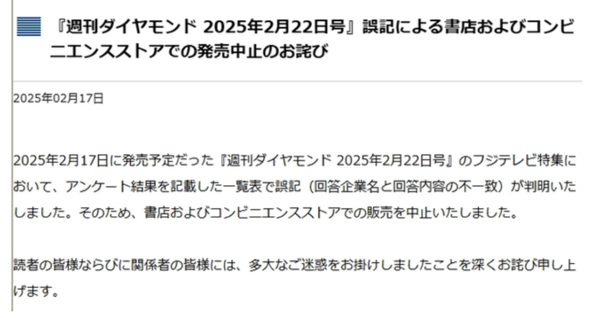 「2025年2月17日に発売予定だった『週刊ダイヤモンド 2025年2月22日号』のフジテレビ特集において、アンケート結果を記載した一覧表で誤記(回答企業名と回答内容の不一致)が判明いたしました。そのため、書店およびコンビニエンスストアでの販売を中止いたしました」と説明。