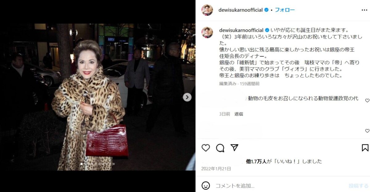 実際、デヴィ夫人のインスタグラムには、今年に入ってから毛皮を羽織った写真がアップされていることから、次のような皮肉を込めたコメントも見受けられる。