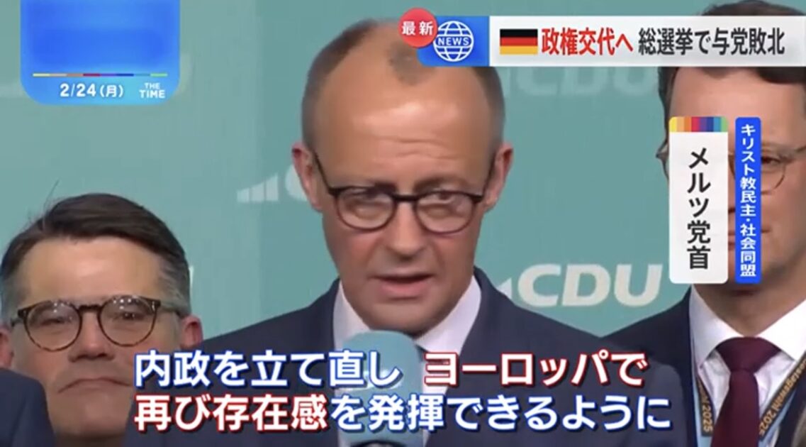 【速報】ドイツ総選挙、最大野党の保守「キリスト教民主・社会同盟」メルツ党首が勝利宣言ドイツでは23日に総選挙が行われ、最大野党の保守「キリスト教民主・社会同盟」のメルツ党首が勝利宣言しました。極右政党も第2党に躍進する見通しです。