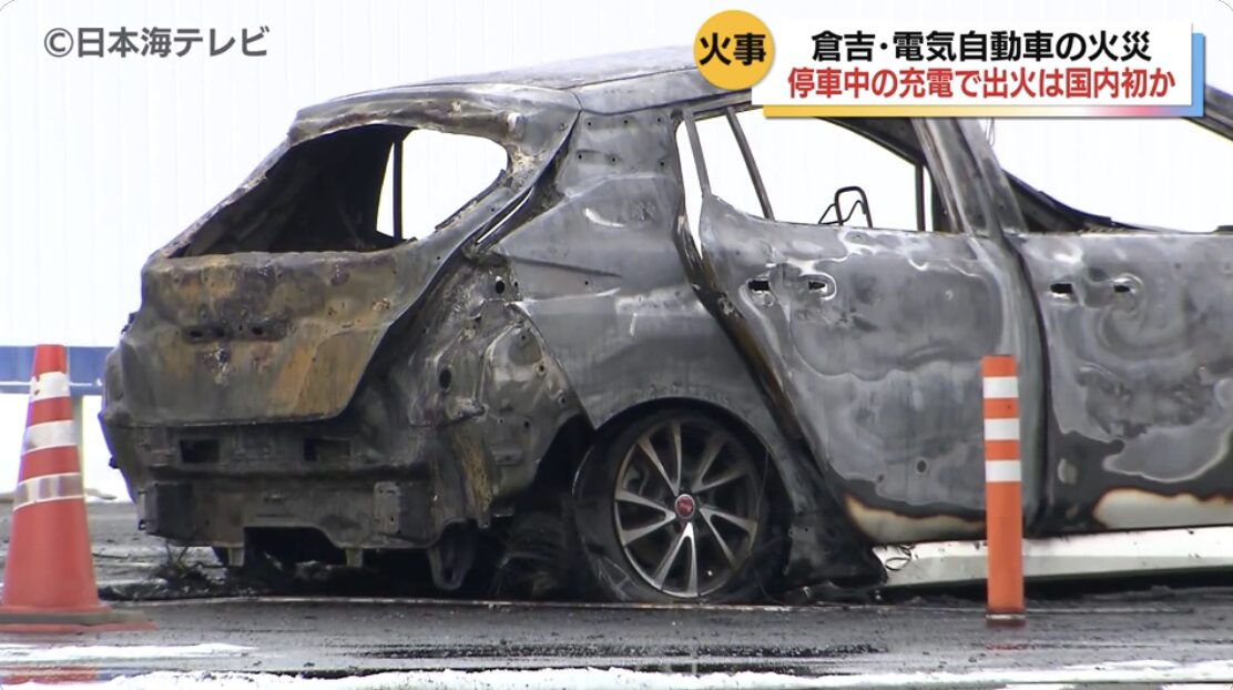2月24日、鳥取県倉吉市で、電気自動車の充電設備で充電していた車から、出火し全焼する車両火災がありました。この火事によるけが人はいませんでした。