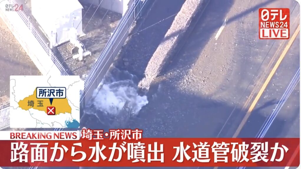 1: 影のたけし軍団 ★ 2025/02/24(月) 15:49:37.18 ID:??? TID:gundan 24日午後、埼玉県所沢市の道路で水が噴き出して冠水している状態だということです。水道管が破裂したとみられています。消防などによりますと、24日午後1時半すぎ、所沢市松が丘で「道... -