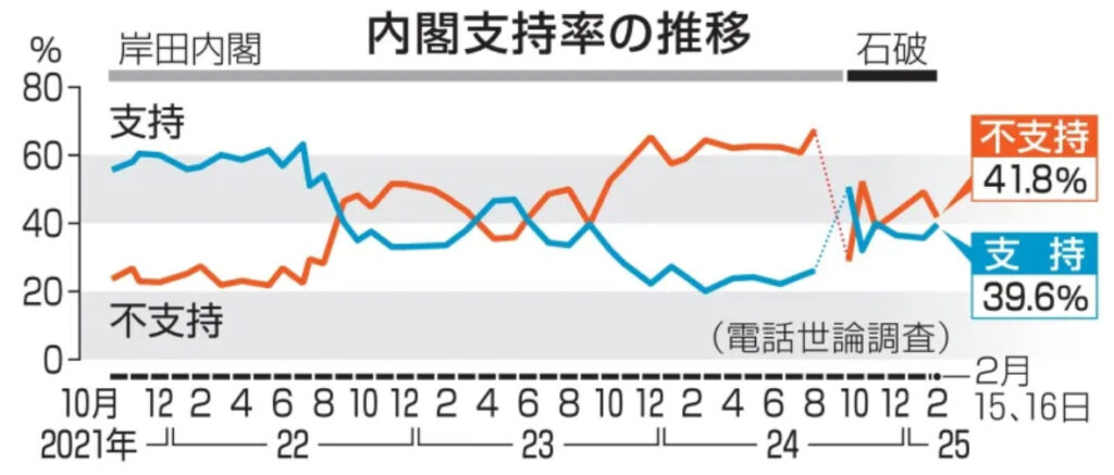 1: SnowPig ★ 2025/02/16(日) 18:01:26.20 ID:??? TID:SnowPig 毎日新聞と社会調査研究センターは15、16の両日、全国世論調査を実施した。 石破内閣の支持率は、1月18、19日実施の前回調査(28%)より2ポイント増の30%で、横ばいだった。 30%台回復は2... -