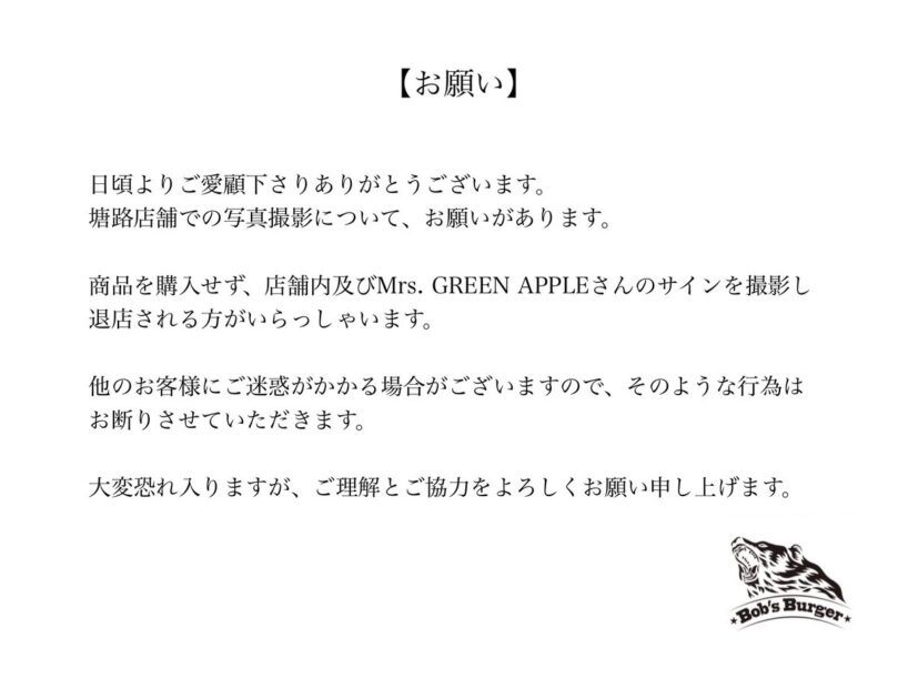 Bob’s Burgerは2月28日、Xで「Bob’s Burgerよりお願いがあります。 何卒よろしくお願い申し上げます。」と綴り、塘路店でのお願いを掲載。「商品を購入せず、店舗内及びMrs. GREEN APPLEさんのサインを撮影し退店される方がいらっしゃいます」とし、「他のお客様にご迷惑がかかる場合がございますので、そのような行為はお断りさせていただきます」とまとめた。