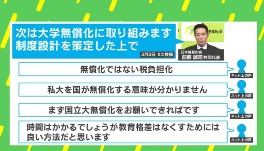 教育無償化をめぐって、日本維新の会の前原共同代表は3日、Xに「次は大学無償化に取り組みます。制度設計を策定した上で」と投稿。