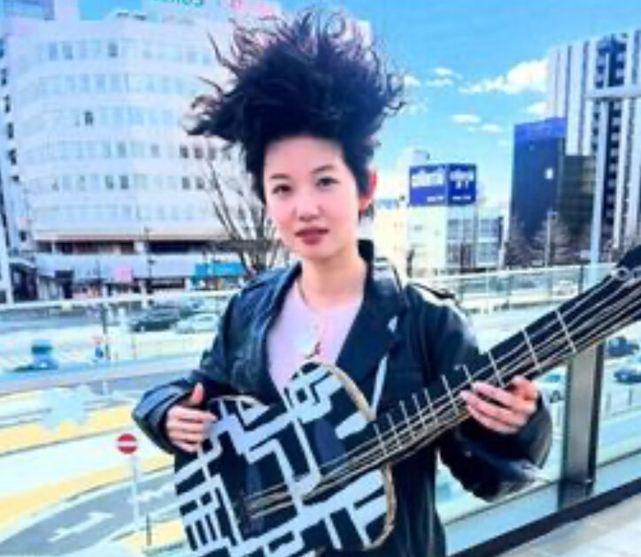 田中アナは、段ボールで作られたギターの模型を肩から下げて、ヘアスタイルや衣装もロックに変ぼう。写真を見たフォロワーは「誰ですか?!」「誰?www」「インパクトありすぎ!」