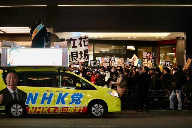 応援にかけつけたNHK党副党首の造船太郎氏(20)や、斉藤健一郎参院議員(44)の演説時から、支持者の声援と立花氏の行動に疑問を持つ有権者からの「帰れ!」コールが交錯。立花氏の登場で、声援と怒号がさらに大きく混じり、批判するプラカードが大きく揺れていた。