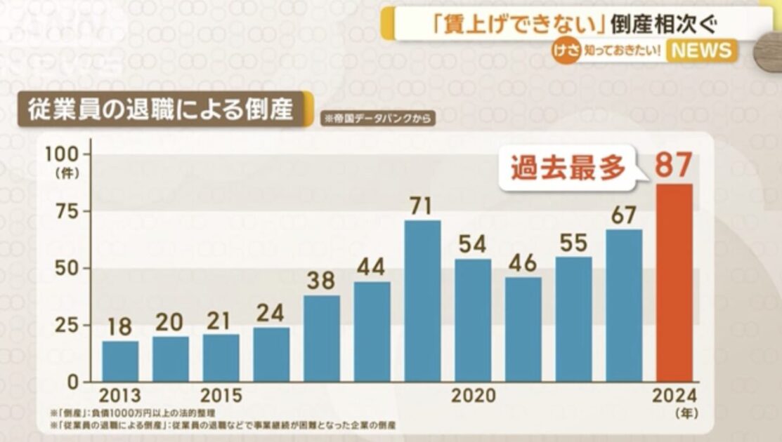 帝国データバンクによりますと、去年、従業員の退職を原因とする企業の倒産は87件で、集計可能な2013年以降で最多となりました。
