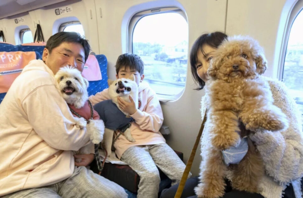 ペット連れで新幹線に乗る場合、通常はかごに入れ、顔を外に出さないのがルール。チワワ2匹を連れた夫婦は
