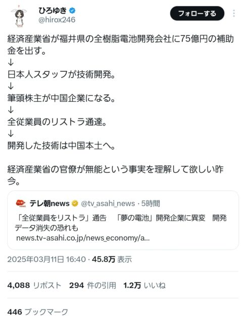 「全従業員をリストラ」通告 「夢の電池」開発企業に異変 開発データ消失の恐れも https://topics.smt.docomo.ne.jp/article/tvasahinews/business/tvasahinews-900020225