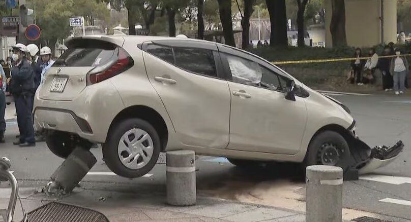 目撃した男性によると、乗用車が歩道に乗り上げながら信号待ちの人たちに衝突。子連れの女性ら2、3人がはね飛ばされたのが見えたという。