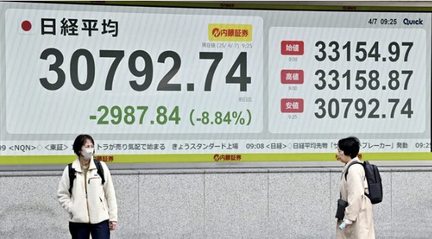米国のトランプ政権が打ち出した関税政策の影響で、7日の東京株式市場は取引開始直後から株価が急落し、個人投資家らの間には「どこまで下がるのか」と動揺が走った。大幅に下落した日経平均株価を示すボード(7日午前、東京都中央区で)=杉本昌大撮影