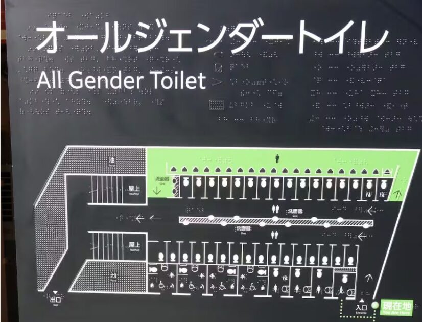 一方、男性専用の個室はなかった。案内板では最寄りの「男女別トイレ」の方角が案内されていた。