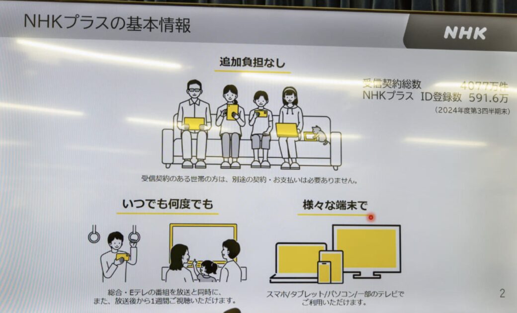 NHKは15日、サービス開始から5年目を迎えたインターネット配信「NHKプラス」の説明会を開催。今年10月の“ネット必須業務化”に合わせ、テレビ向けアプリにおいても、常時同時配信機能を提供する準備を進めていることを明らかにした。実現すれば、チューナーレステレビにおいても、ネットを通じて、通常のテレビと同じようにNHKの地デジ番組をリアルタイムで視聴できるようになる。NHKプラスのテレビ向けアプリは、Google TV搭載テレビ(ソニーやシャープなど)、Fire OS搭載テレビ(パナソニックなど)、レグザやハイセンス、LGなどのスマートテレビ、Fire TV Stickといったストリーミングデバイスなどで現在提供中だが、これまでは見逃し番組配信しか利用できなかった。10月以降は、対応デバイスで常時同時配信も順次利用できるようになる予定。
