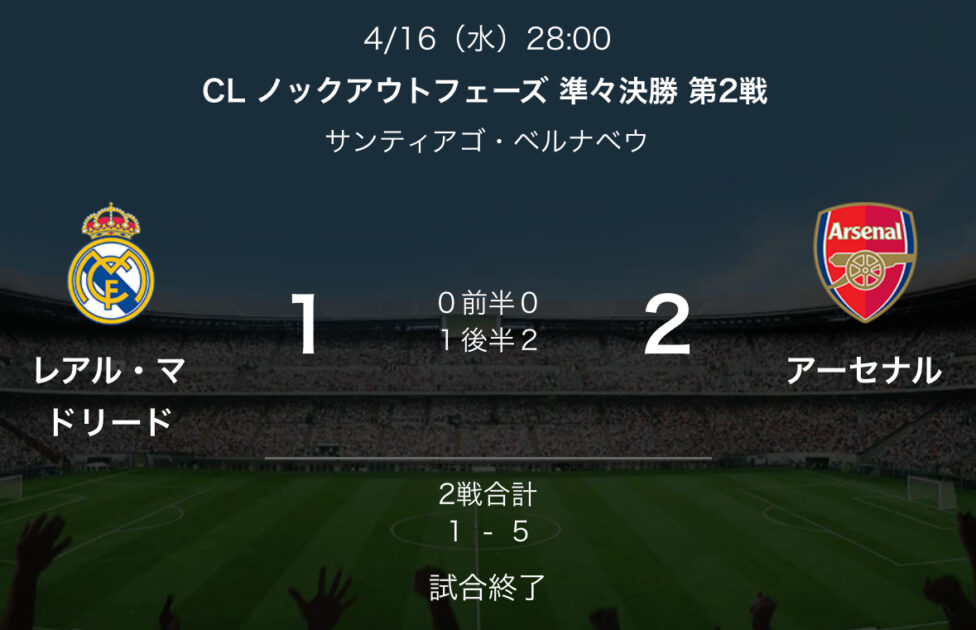 このままアーセナルが2-1で勝利し、アグリゲートスコア5-1でベストに進出。マドリーは連覇の夢が潰えた。