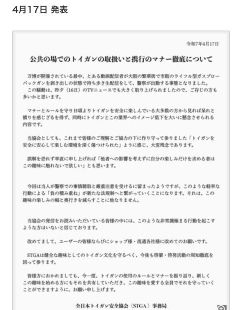 全日本トイガン安全協会(STGA)は4月17日、大阪万博に際して会場周辺でエアガンを取り出し徘徊した人物がいたことを受けて声明を発表した。