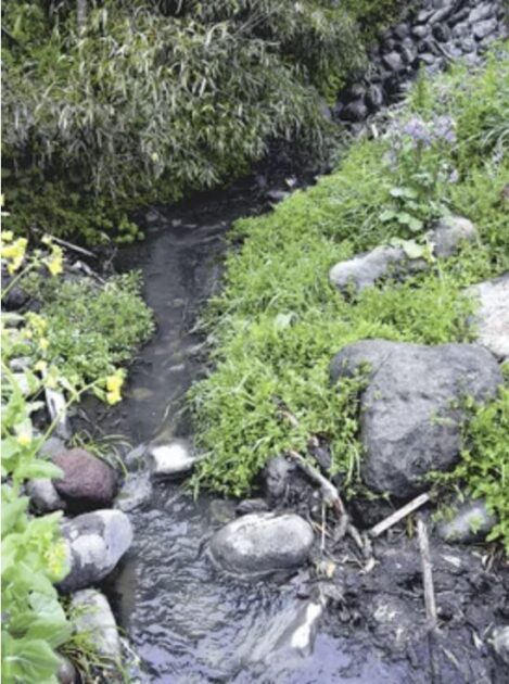 現場を撮影した画像では、排水溝から河川に流れる水が赤く染まっている様子が確認できる。殺処分した豚を埋めた場所の地下にある排水パイプから伝わったとみられる。