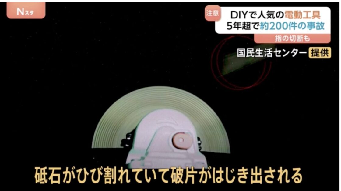これは円盤状の砥石を回転させて、材料を切ったり磨いたりするディスクグラインダと呼ばれる工具。砥石がひび割れていたため、破片が勢いよくはじき出されてしまいました。