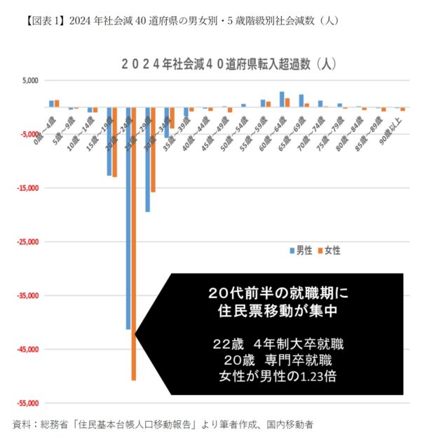 そして、2024年に社会減となってしまったこの40道府県の社会減の詳細を男女別、5歳年齢階級でみてみると、前年と変わらず、20代前半人口を大きく社会減させてしまっている(図表1)。