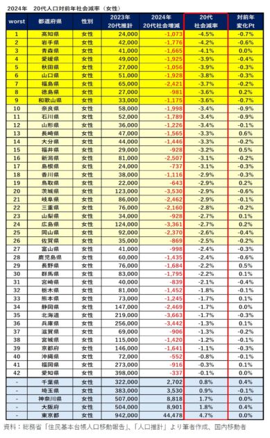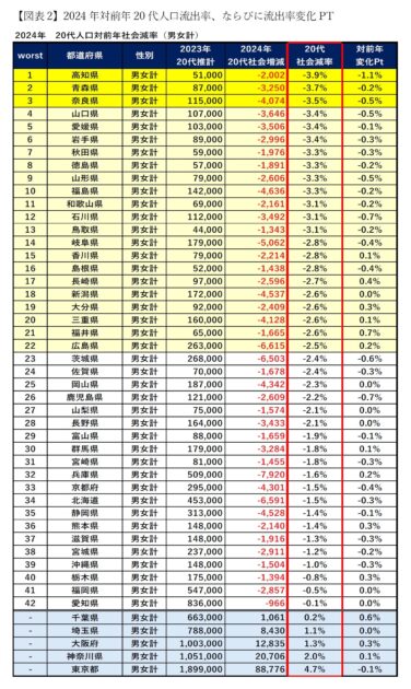 【社会】「都道府県人口減の未来図」-2024年都道府県20代人口流出率ランキング