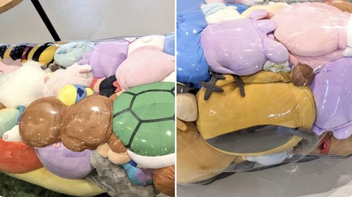 透明のビニールに圧縮して固めたぬいぐるみをベンチにしたもので、同社は出展当初「遊ばれなくなったぬいぐるみたちに、次の役割を与えたいという想いからつくられたアップサイクル家具です」と説明。SNSでは「ぬいぐるみベンチ」がトレンド入りし、「可哀想」「受け入れられない」「悪趣味」といった声が相次いでいた。