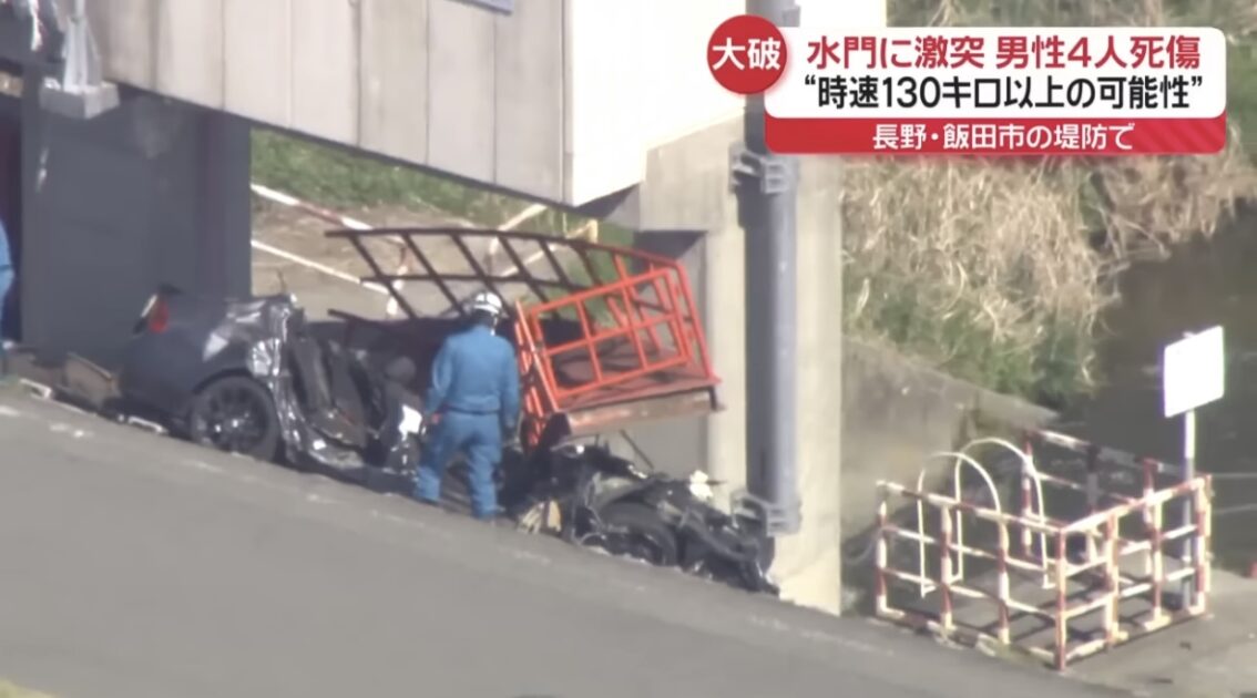 24日、長野県飯田市で天竜川の堤防上の道路を走っていた乗用車が道路脇にある水門に衝突した事故で、警察によりますと乗っていた男性4人全員の死亡が確認されました。