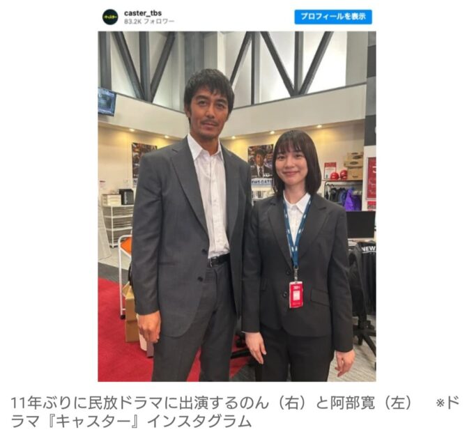 放送に先駆け、番組公式SNSでは主演の阿部寛とのんの2ショットが公開され、「阿部さんとのんさんの共演は約12年ぶりとのこと! 久々の再会に、終始和やかなムードで撮影が行われました」と伝えられた。