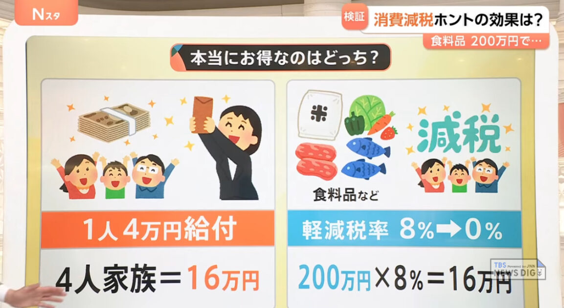 4万の給付は財政負担が大きすぎるので、食料品消費税ゼロでいいです