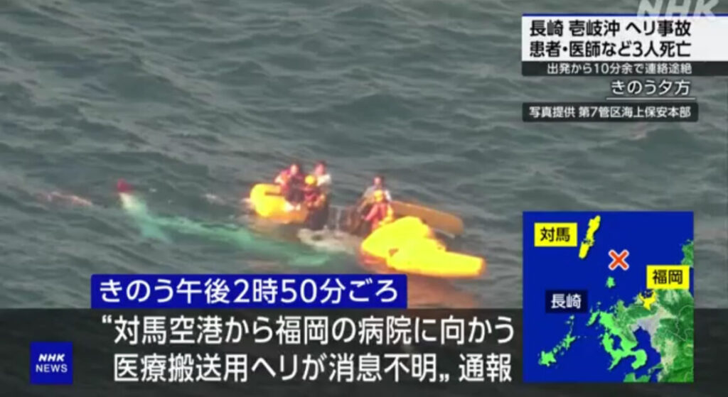 1: Ikhtiandr ★ 2025/04/07(月) 05:52:06.78 ID:g9q7ED0d9 BE:456446275-2BP(1000) sssp://img.5ch.net/ico/anime_morara01.gif 6日、長崎県の対馬から福岡市の病院に患者を運んでいたヘリコプターの消息がわからなくなり、壱岐の沖合で見つかった事故で、... -