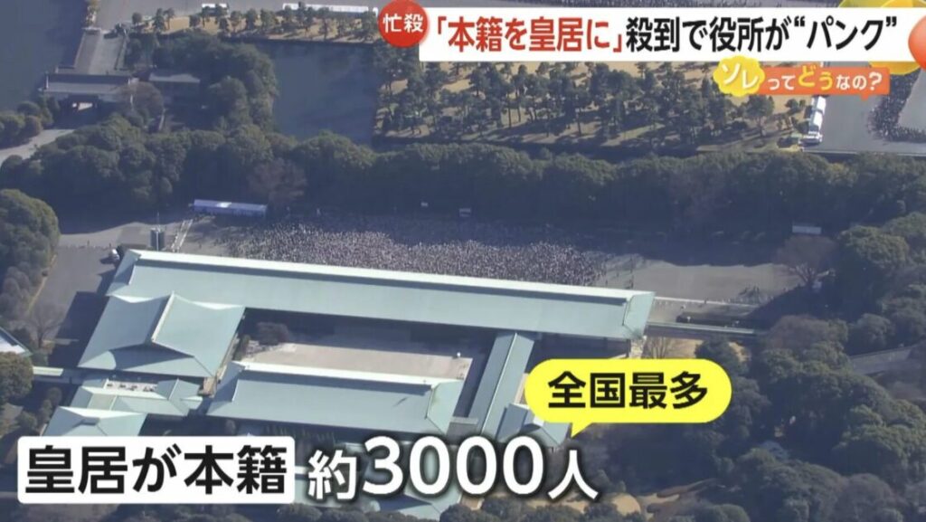 1: 七波羅探題 ★ 2025/03/31(月) 18:26:28.23 ID:TBzv9giL9 【忙殺】「本籍を皇居に」申請殺到で役所パンク…戸籍法改正で“人気スポット”に本籍指定が急増「東京ディズニーランド」「大阪城」など人気 本籍を皇居にする申請が急増し、千代田区役所が対応に... -