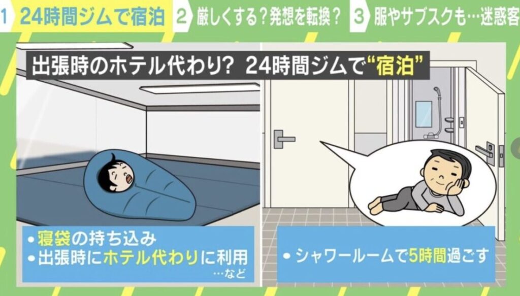 【困惑】24時間ジムで「宿泊」 寝袋を持参&シャワー室に5時間 「出張時のホテル代わり」にする人まで