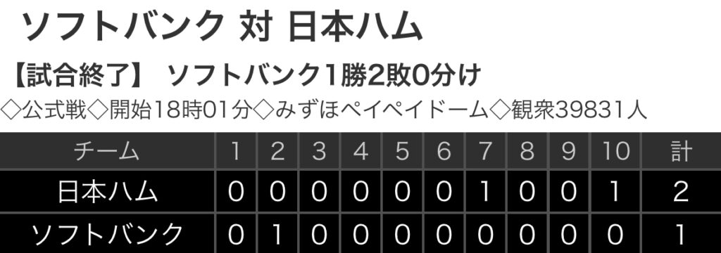 1: 鉄チーズ烏 ★ 2025/04/29(火) 21:15:19.76 ID:+eob/APK9 日本ハム 0 0 0 0 0 0 1 0 0 1|2 ソフトバンク . 0 1 0 0 0 0 0 0 0 0|1 【バッテリー】 (日)伊藤、田中正 - 伏見 (ソ)モイネロ、松本裕、オス... -